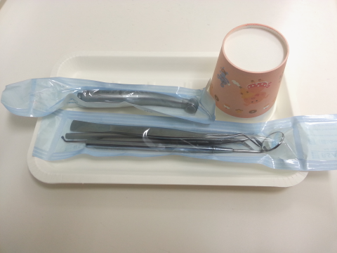 患者様に使用するセットとして一回きりの処分が望ましいコップやトレーは紙製によるディスポーザブルな(一回使用限りで廃棄できる)ものを使用しております。